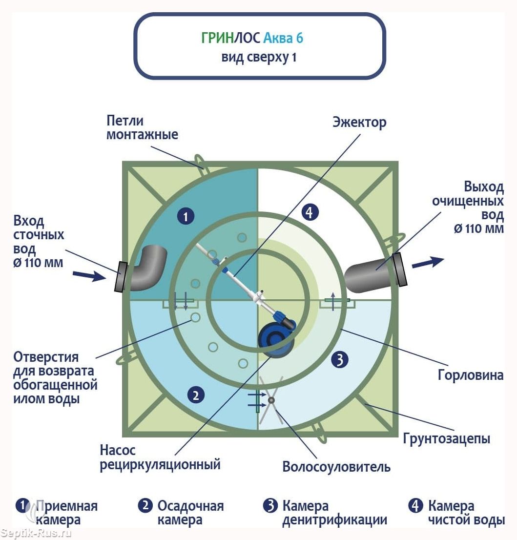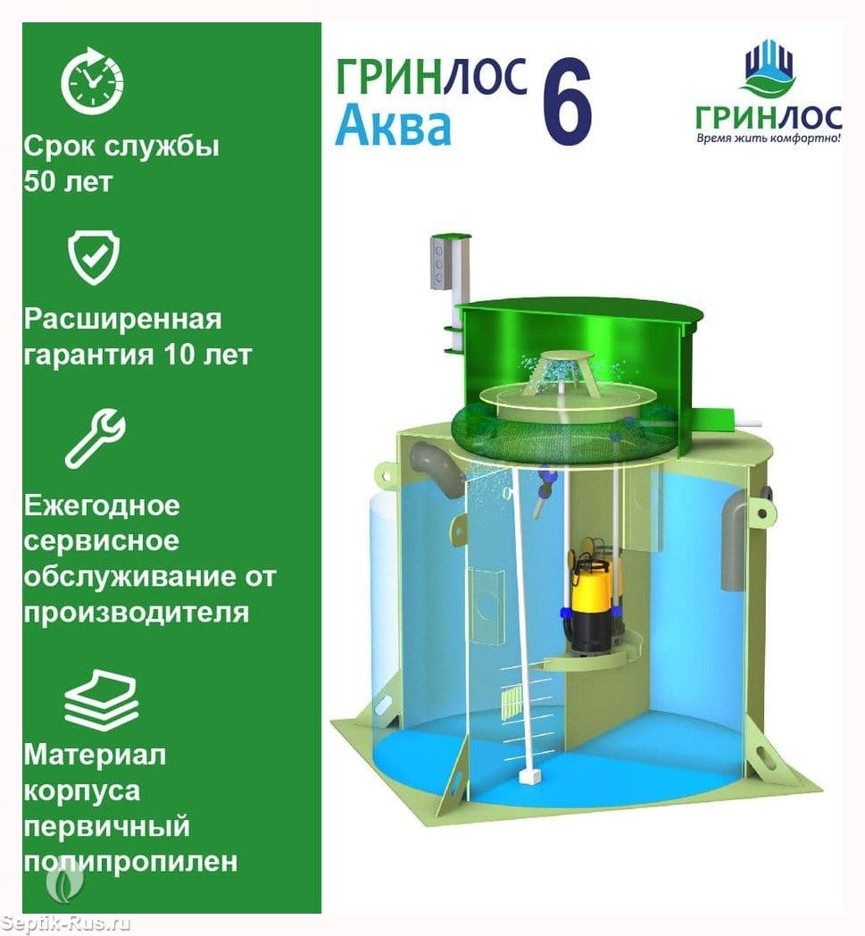 ГРИНЛОС Аква 6 изготавливаются из полипропилена чешского производства. Нижний уровень разделен на четыре отсека со специальными технологическими переливами. Перетекая из одного отстойника в другой, стоки проходят первоначальный процесс отстаивания, усреднения стоков, отделения нерастворимых фракций (жиров и т.д.), которые остаются в первом отсеке. При этом уже в первом отсеке начинается очистка стоков свободным активным илом. Затем, из третьего отсека, стоки посредством дренажного насоса подаются на верхний уровень, на специальный разбрызгиватель, через который происходит орошение биофильтра.