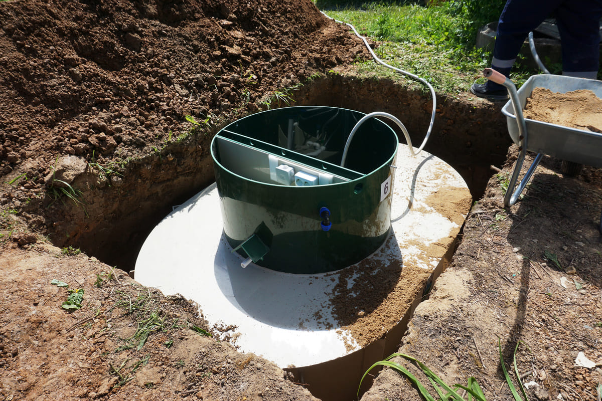 Монтаж с отводом очищенных сточных вод в фильтрующий колодец. Подходит для хорошо поглощающих грунтов (песок, супесь) и низком уровне грунтовых вод.