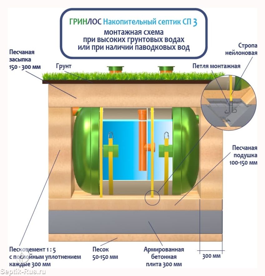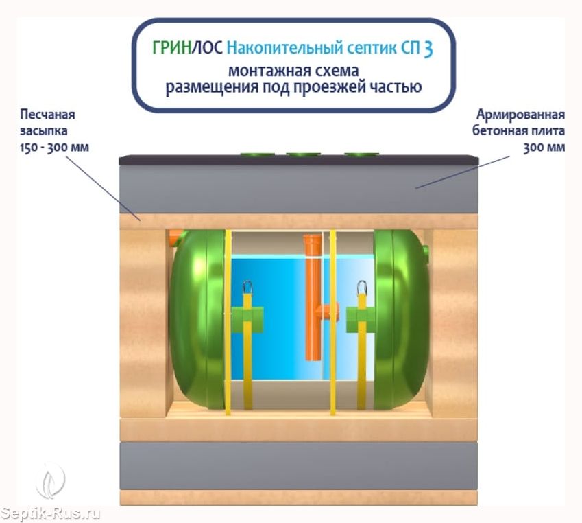 Поверх корпуса оборудования насыпается песчаный слой высотой 150-300 мм. Для подключения оборудования к внутренней канализационной системе используются предназначенные для этого канализационные трубы.