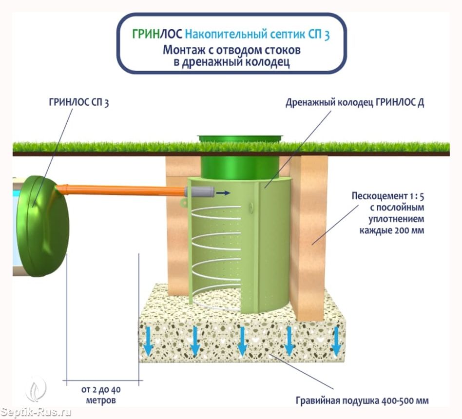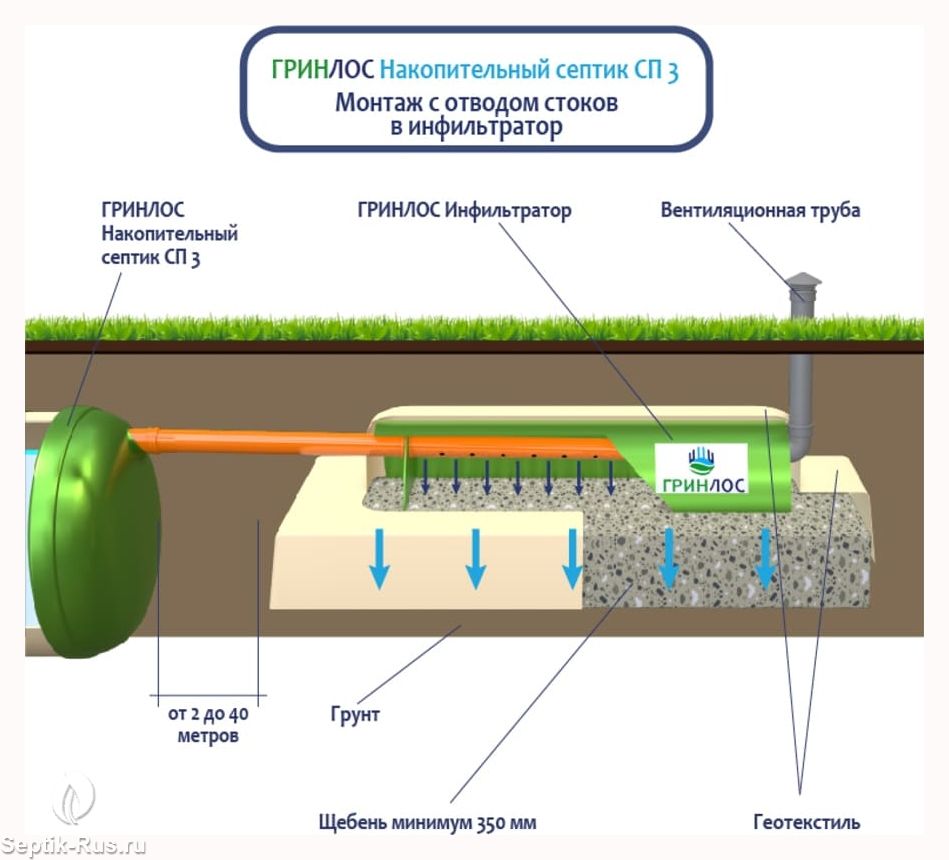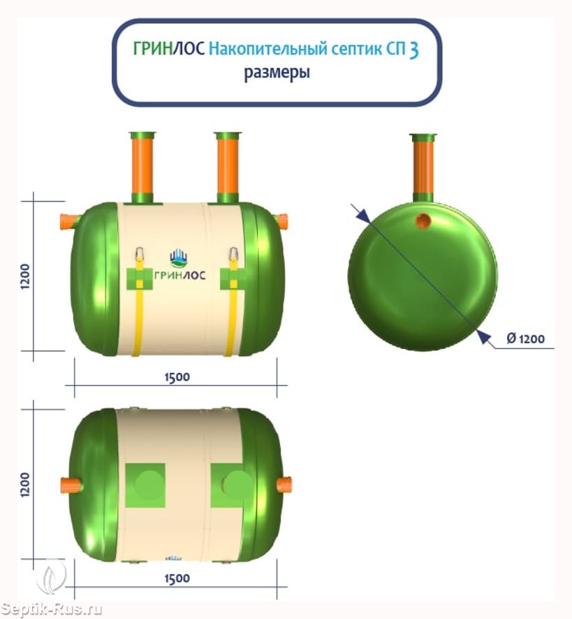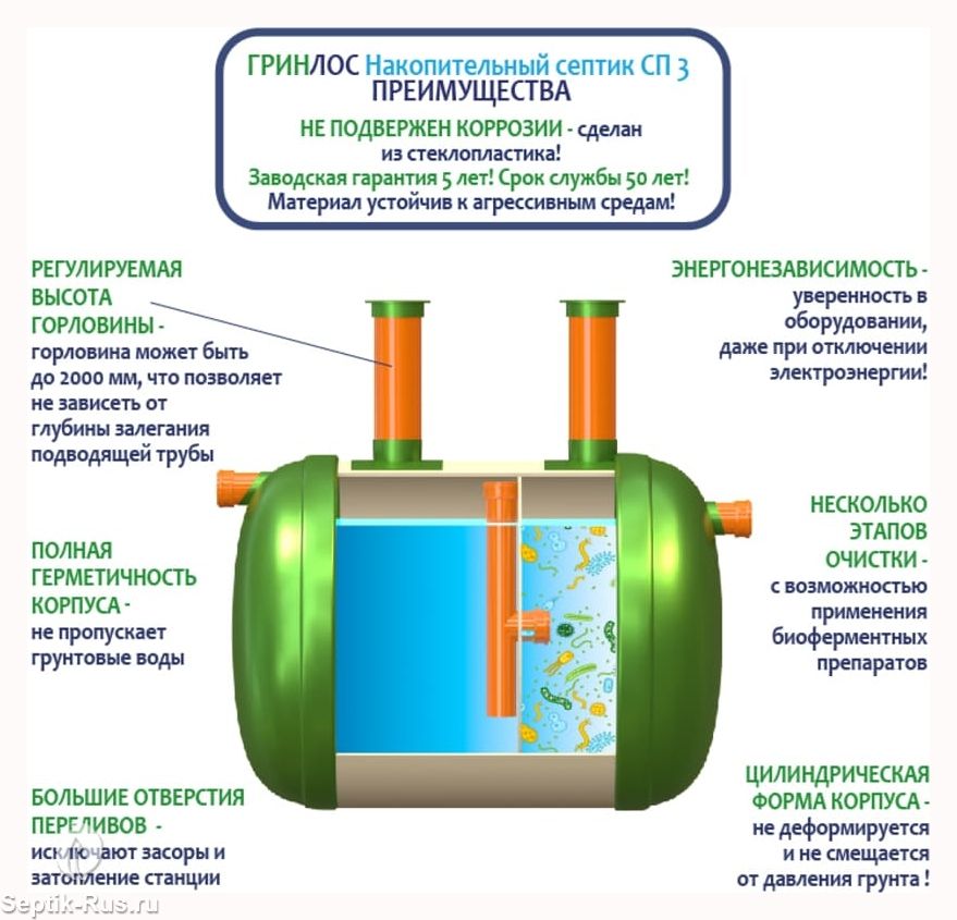 Герметичная конструкция Гринлос Накопительного септика СП 3 исключает трещины и разгерметизацию, защищая окружающую среду и здоровье людей. Грунт и подземные воды надежно защищены от загрязнений, предотвращая неприятные запахи и попадание вредных веществ.